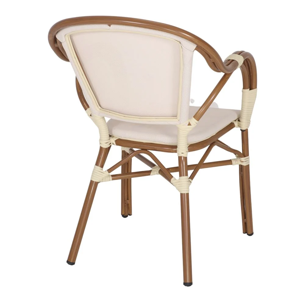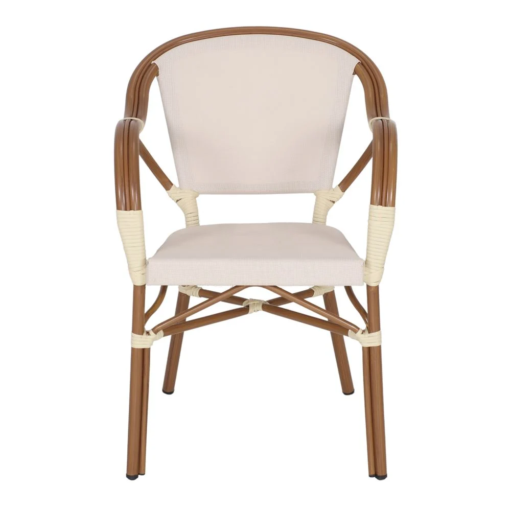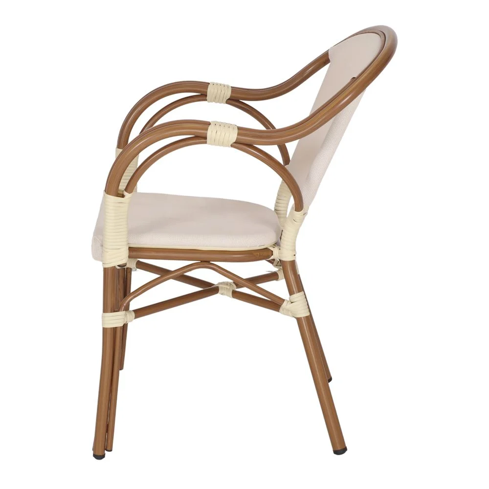 Silla de exterior Tender, de estilo Bistró. Estructura de aluminio con acabado en imitación a bambú. Asiento y respaldo tapizados en textilene. Detalles en médula de ratán sintético. Válida para exterior. Apilable. Medidas: 56x59x84 cm | Altura del asiento: 45 cm | Altura del reposabrazos: 68 cm