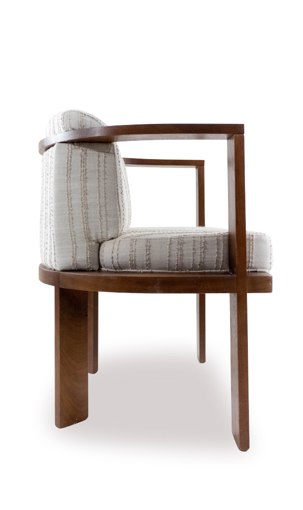 La silla Donosti tiene patas anchas y planas que ofrecen estabilidad y aportan un toque distintivo al diseño. Un detalle clave son los brazos, que rodean el cojín del respaldo. Este diseño especial otorga a la silla un carácter único, convirtiéndola en una pieza central en cualquier espacio. Los cojines, tanto del asiento como del respaldo, están rellenos con goma de alta densidad, lo que asegura una comodidad inigualable. Además, la base de la silla, fabricada en madera, asegura una estructura sólida y duradera, convirtiéndola en un mueble funcional y estéticamente atractivo.