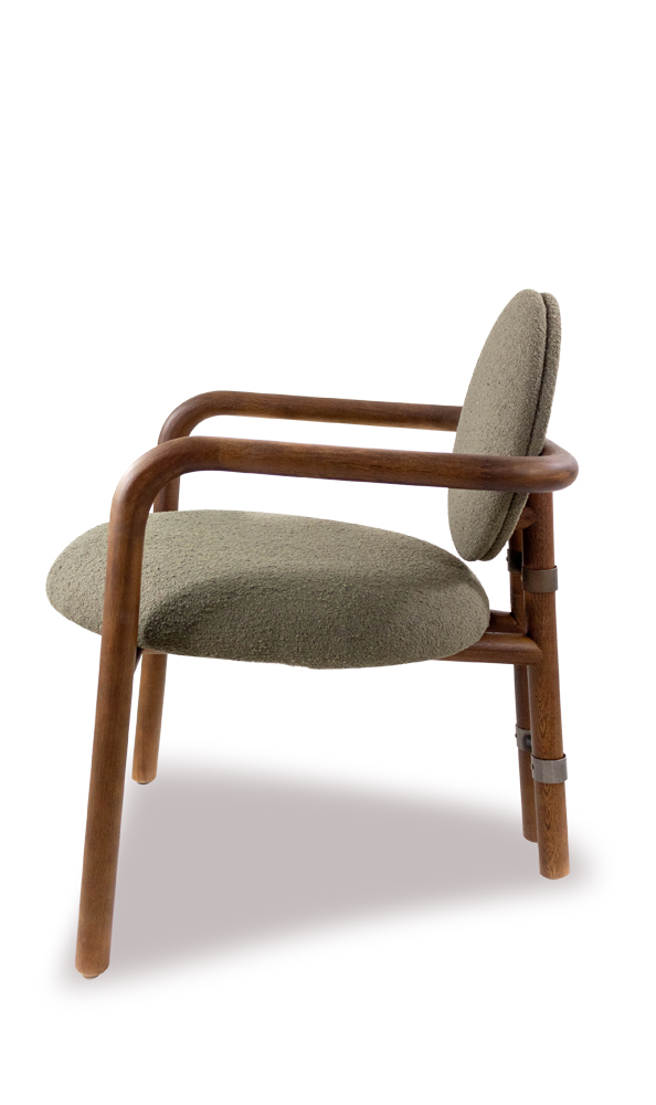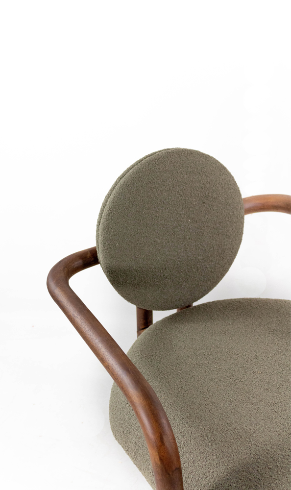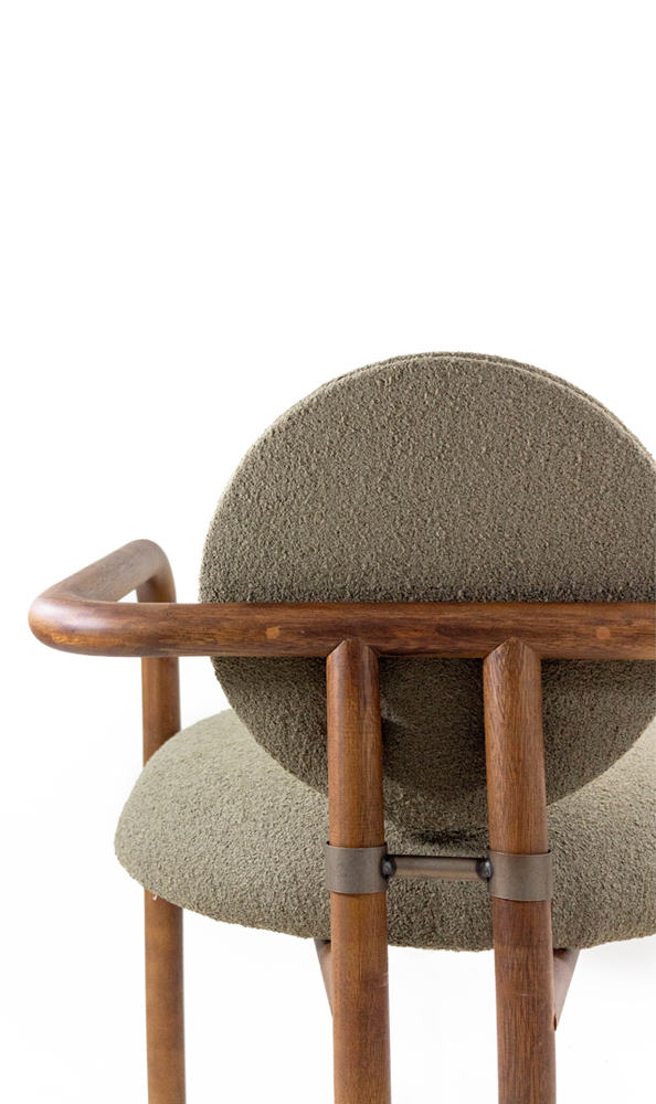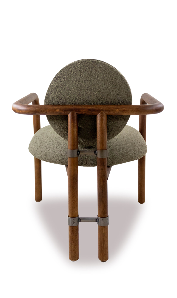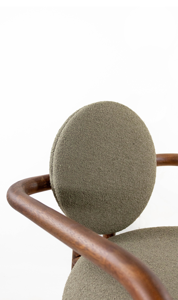 La silla Magna se distingue por su respaldo pequeño y circular. Aunque compacto, proporciona un soporte excelente para la espalda. Este diseño asegura una experiencia de asiento ergonómica y confortable, ideal para relajarse o trabajar por largos períodos. Los brazos de la silla son de madera y tienen un elegante acabado cónico. Se integran armoniosamente con el respaldo curvo y se extienden hacia adelante. Eventualmente, se transforman en las patas delanteras, añadiendo estabilidad y un toque estético. Las patas traseras, rectas y casi pegadas al respaldo, están unidas por herrajes de metal, que refuerzan la estabilidad. El asiento circular, de 10 cm de grosor y relleno de goma de alta densidad, es otro punto fuerte. Esta composición garantiza una comodidad superior. La base del asiento, formada por palos que siguen el diseño de los brazos y las patas, proporciona un soporte firme y duradero.