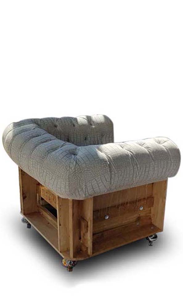 Capitoné artesanal y estructura expuesta en el sillón Chester Rústico